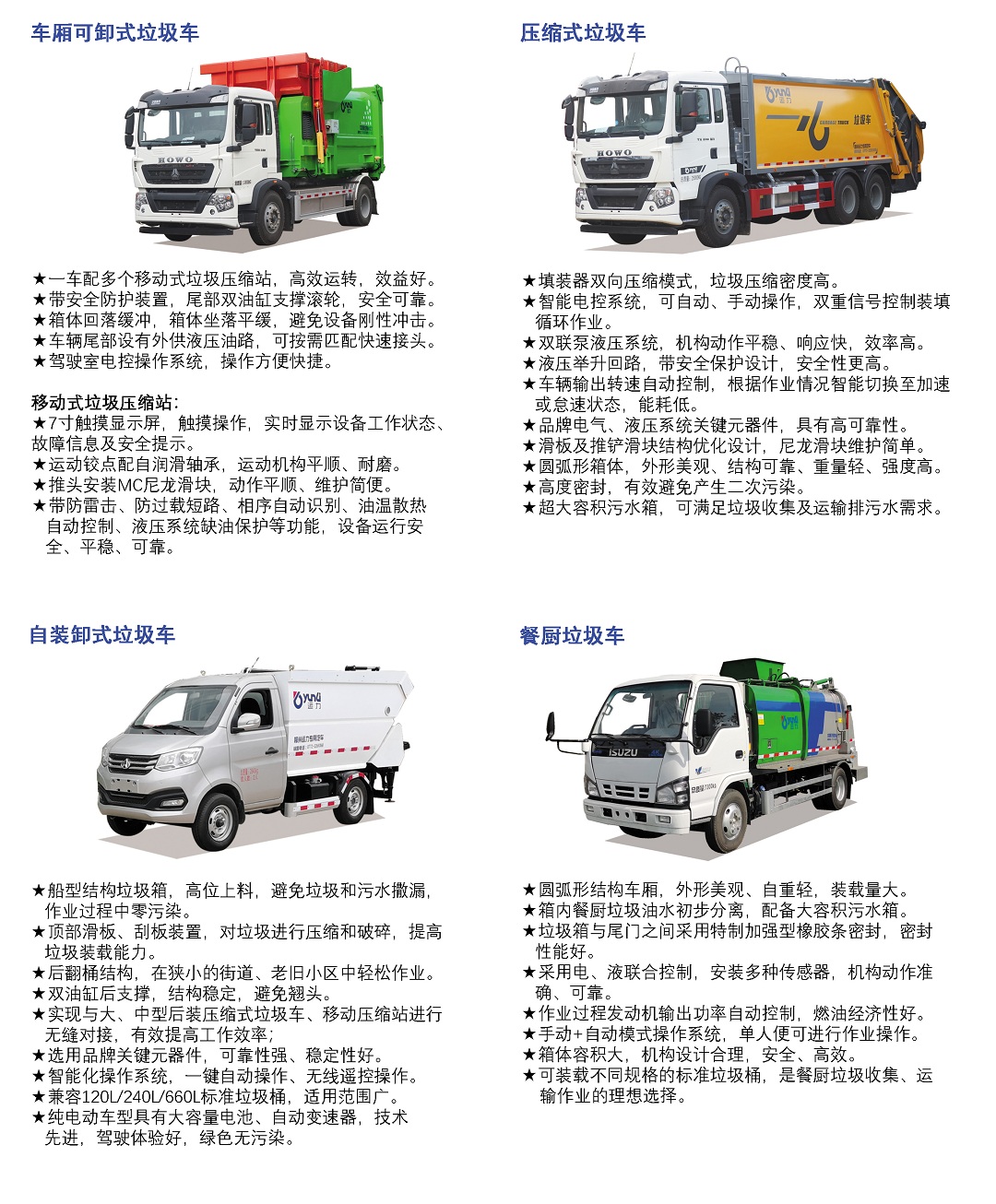 運力牌垃圾類環衛車有車廂可卸式垃圾車、移動式垃圾收集站、壓縮式垃圾車、自裝卸式垃圾車、餐廚垃圾車共五大類,涵蓋大、中、小(xiao)多(duo)種(zhong)車(che)型(xing),滿(man)足(zu)各(ge)類(lei)工(gong)況(kuang)需(xu)求(qiu)。產(chan)品(pin)具(ju)有(you)強(qiang)大(da)的(de)垃(la)圾(ji)收(shou)集(ji)能(neng)力(li),搭(da)載(zai)智(zhi)能(neng)操(cao)控(kong)係(xi)統(tong),垃(la)圾(ji)箱(xiang)容(rong)積(ji)大(da),車(che)輛(liang)運(yun)輸(shu)效(xiao)率(lv)高(gao),操(cao)作(zuo)輕(qing)鬆(song),適(shi)應(ying)性(xing)強(qiang)。