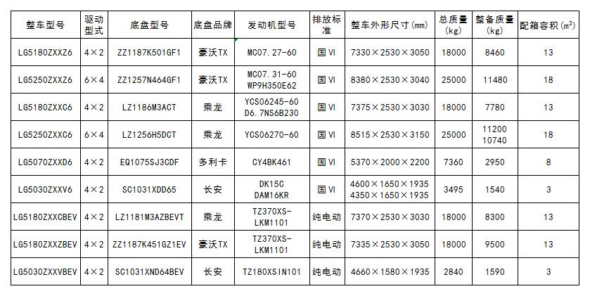 車廂可卸式垃圾車產品參數(截止至工信部第354批公告)