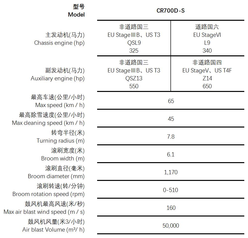 ·底盤:雙發動機4×4專用二合一掃雪車底盤 ·主發動機:325-500馬力,康明斯、卡特、沃爾沃 排放:中國道路國六,中國非道路國三、國四,EU StageⅢB、V、VI,US T3、T4F ·副發動機:450-650馬力,康明斯、卡特、沃爾沃 排放:中國非道路國三、國四,EU Stage V、VI,US T3、T4F ·變速箱:美國艾利遜液力變矩器自動變速箱,6前進擋,1後退檔 ·轉向模式:4×4計算機控製四輪轉向(蟹行、四輪、後輪、前輪) ·滾刷寬度:4.2、4.8、5.6、6.1、6.7 米 ·滾刷直徑:1,170 毫米,914 毫米 ·滾刷轉速:0-510 轉/分鍾,0-700 轉/分鍾(可選) ·滾刷扭矩:4,000-6,000 牛·米 ·滾刷擺角:32°或35° ·片式刷苗,材質:全聚丙烯、全彈性鋼絲、聚丙烯和彈性鋼絲交替混合 ·最高車速:65公裏/小時, 80 公裏/小時 ·除雪速度:3-45 公裏/小時 ·最低穩定速度:3 公裏/小時 ·吹雪鼓風機最高風速:160 米/秒 ·吹雪鼓風機最高風量:50,000 米3/小時 ·轉彎半徑:7.8 米 ·選裝1:選裝3500噸/小時拋雪頭,除雪寬度2.75米(與滾刷互換) ·選裝2:油氣懸掛