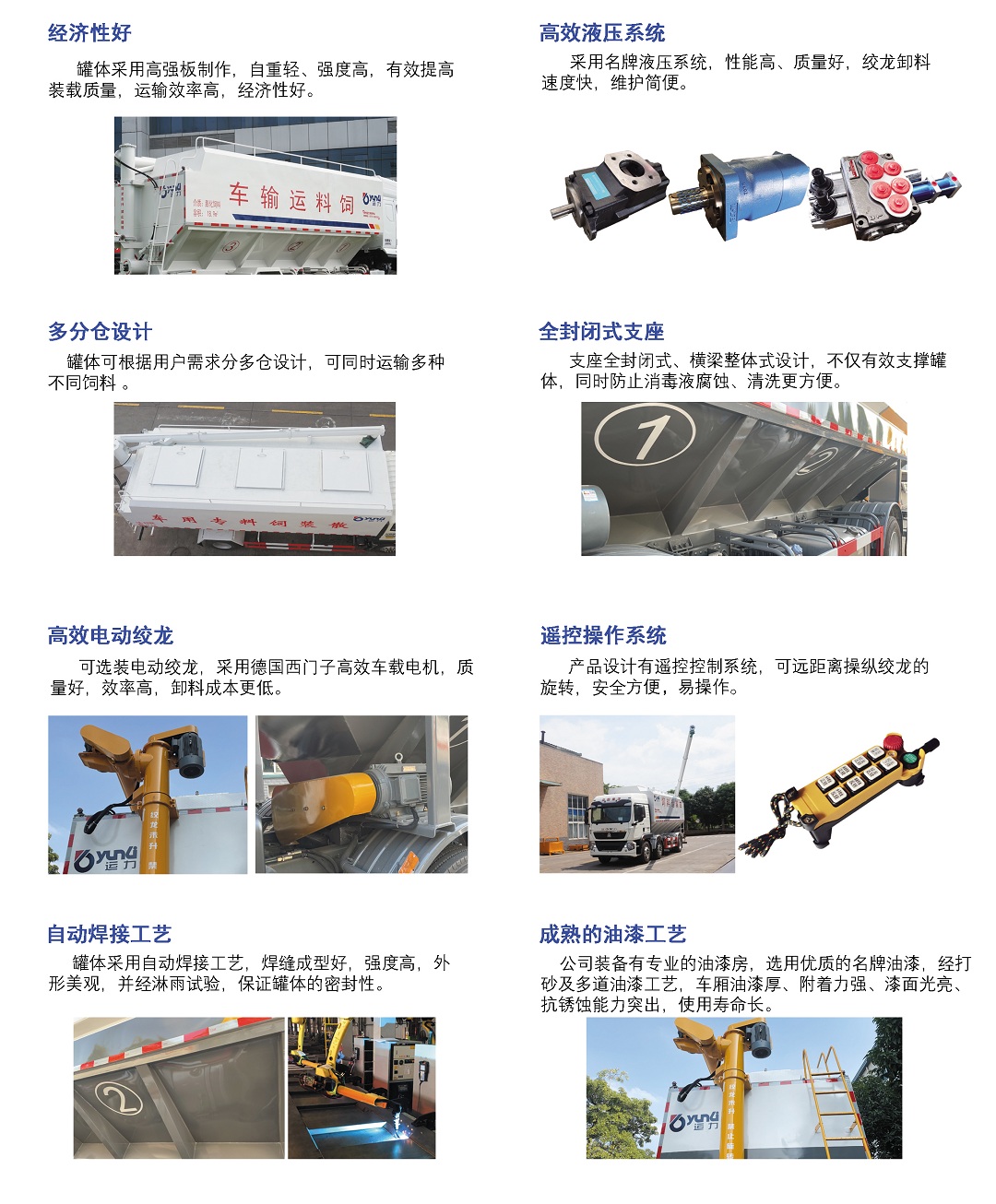 運力牌散裝飼料運輸車,采用三維設計技術,罐體采用高強度板材製作,自重輕、強度高、重心低。罐體多倉設計,可同時裝載多種飼料;jinglinyushiyan,mifengxinghao,baozhangsiliaobushouwuran。caiyongguojimingpaiyeyaxitong,zhilianghao,weihujianbian。kegenjuyonghuxuyaoxuanzhuangdiandongjiaolong,gengjiajingjijieneng。
