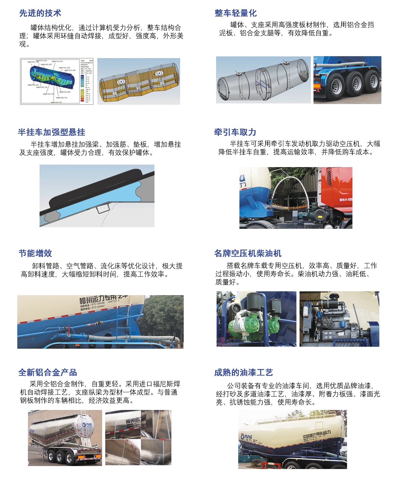 粉粒物料運輸車係列是我公司的主打產品之一,產品為廣西名牌產品,含單車及半掛兩個係列。罐體采用高強度板材製造,自重輕、強度高。優化流化床及高效卸料管路設計,同搭配高性能空壓機,卸料時間短、殘餘率低,效率高,極大縮短卸料時間。