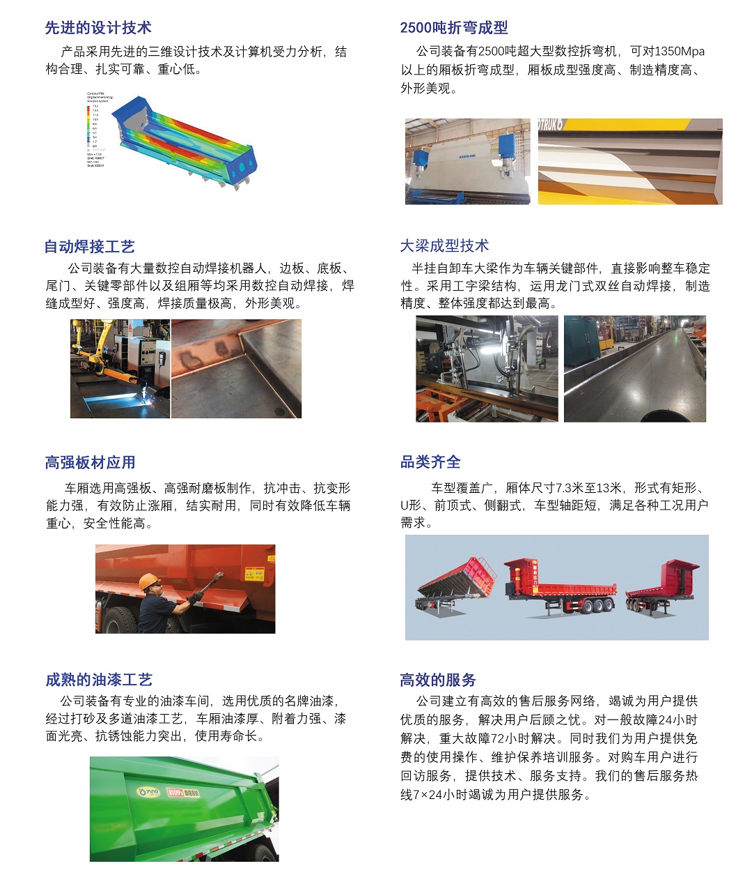 自卸半掛車是公司的主打產品之一,產品包括前頂式和側翻式兩大類,廂長涵蓋7.3至13米。產品采用三維設計,經受力分析,整車性能突出、結構合理、重心低、可靠性高。運力牌自卸車有著 “廣西名牌產品”的榮譽,產品憑過硬的產品質量,在區域市場中占有率一直保持前列,在海外市場也擁有不俗的市場份額。