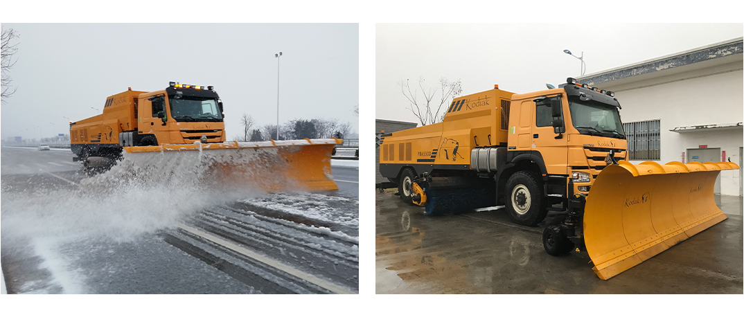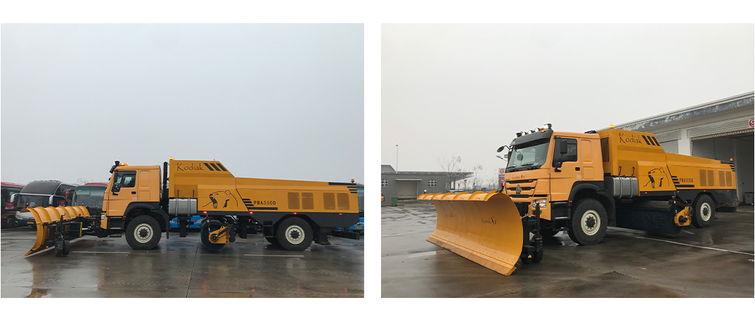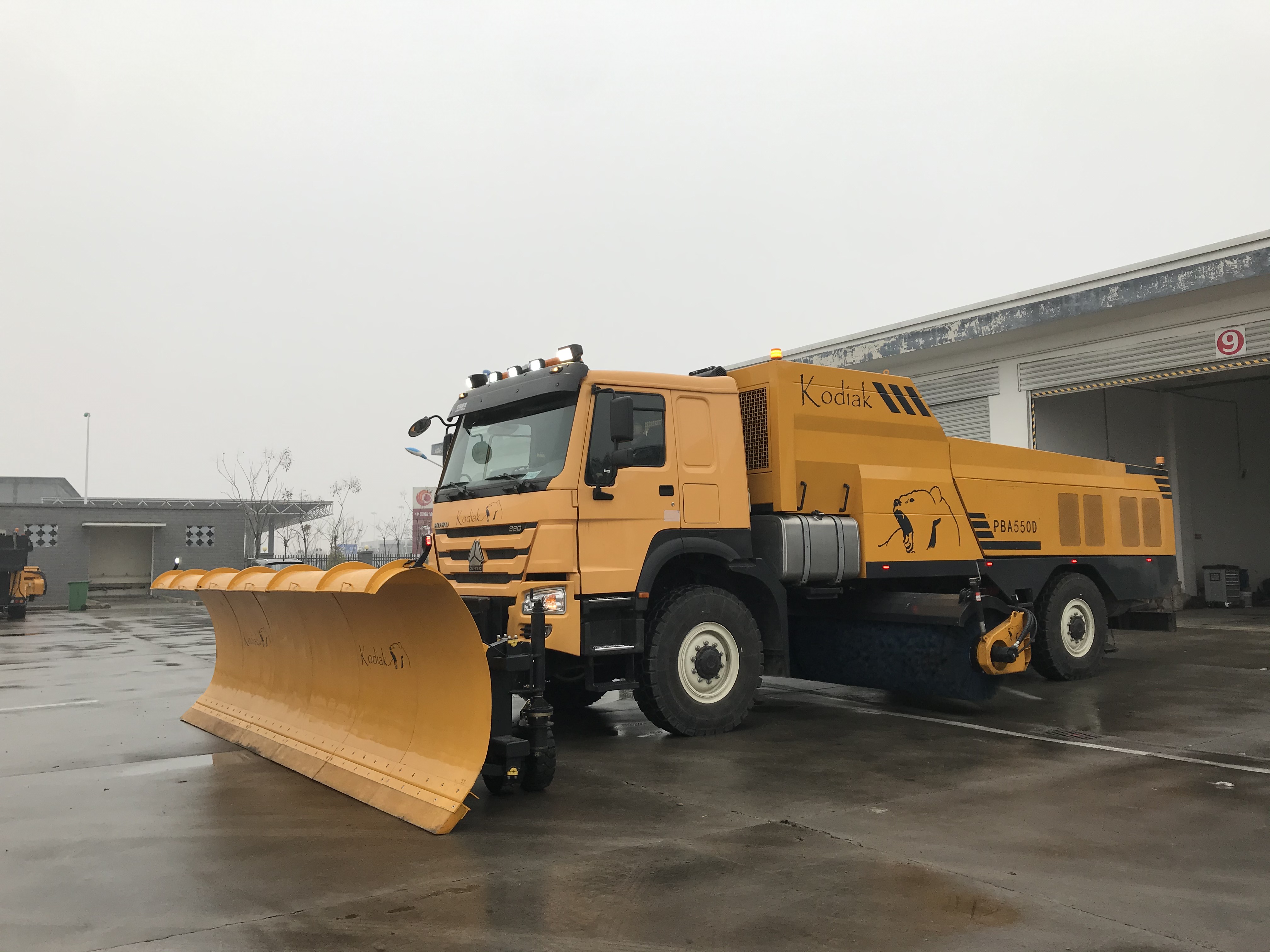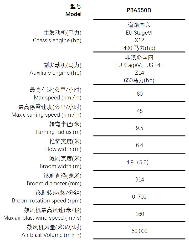 機場跑道三合一除雪車 ·底盤:雙發動機4×4專用三合一底盤,拱形大梁結構 ·主發動機:438-550 馬力,康明斯、卡特、沃爾沃 排放:中國道路國六,中國非道路國三、國四,EU StageⅢB、V、VI,US T3、T4F ·副發動機:500-650 馬力,康明斯、卡特、沃爾沃 排放:中國非道路國三、國四,EU Stage V、VI,US T3、T4F ·變速箱:美國艾利遜液力變矩器自動變速箱,6前進擋,1後退檔 ·轉向模式:4×4計算機控製四輪轉向(蟹行、四輪、後輪、前輪) ·懸掛模式:油氣懸掛,可以鎖定 ·推鏟寬度:5.6米,  6.4米 ·滾刷寬度:4.2 米(4.9米), 4.9米(5.6米), 5.6米(6.3米) ·滾刷直徑:914 毫米 ·滾刷轉速:0-700 轉/分鍾,0-900 轉/分鍾 ·滾刷扭矩:1,600-2,500 牛·米 ·滾刷擺角:32°,35° ·插條式刷苗,材質:全聚丙烯、全彈性鋼絲、聚丙烯和彈性鋼絲交替混合 ·最高車速:65 公裏/小時,80 公裏/小時 ·除雪速度:3-45 公裏/小時 ·最低穩定速度:3 公裏/小時 ·吹雪鼓風機最高風速:160 米/秒 ·吹雪鼓風機最高風量:5 萬立方米/小時 ·轉彎半徑:9.5 米